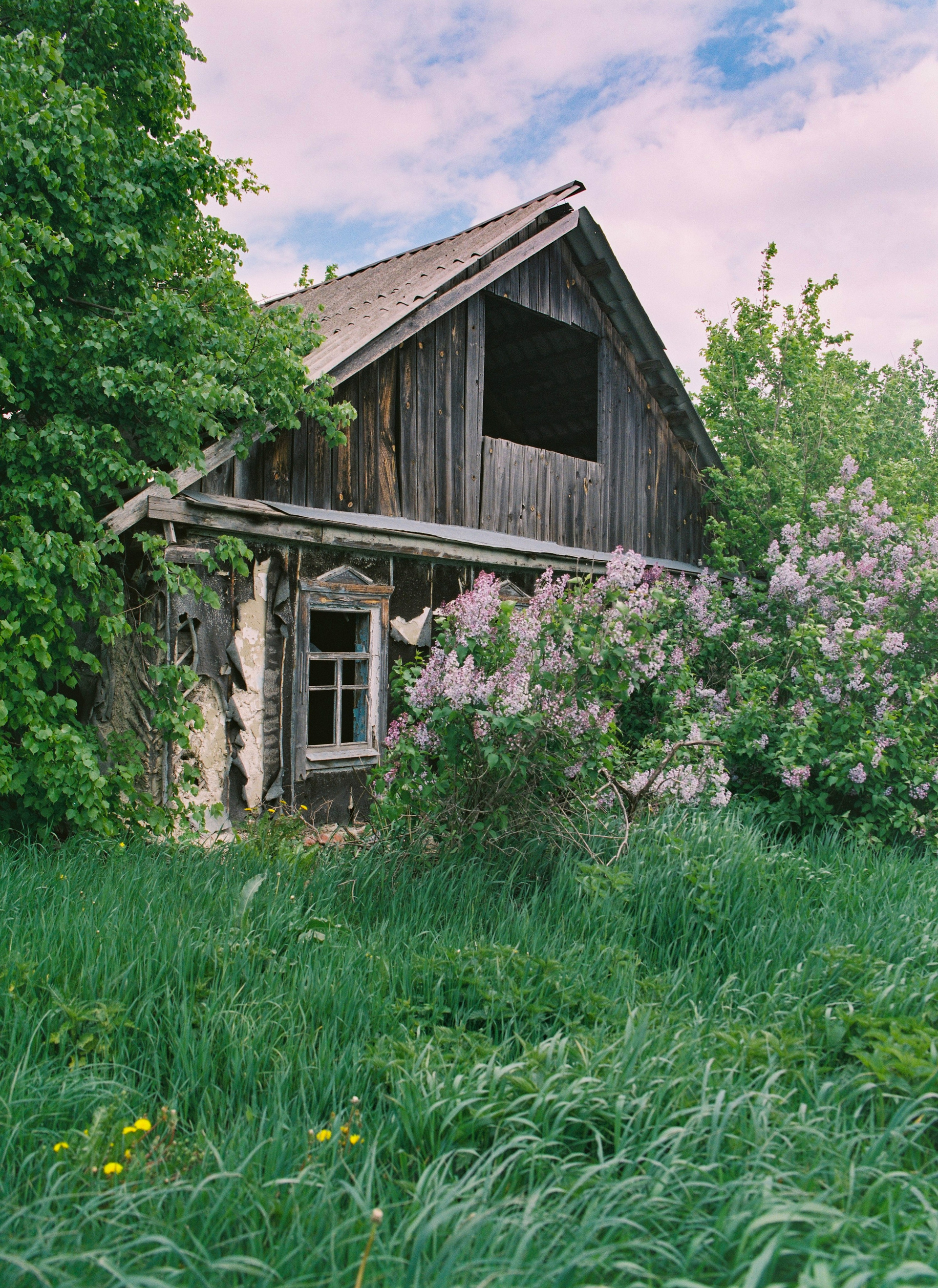 Lilac bush in front of abandoned house, hometown. 2025