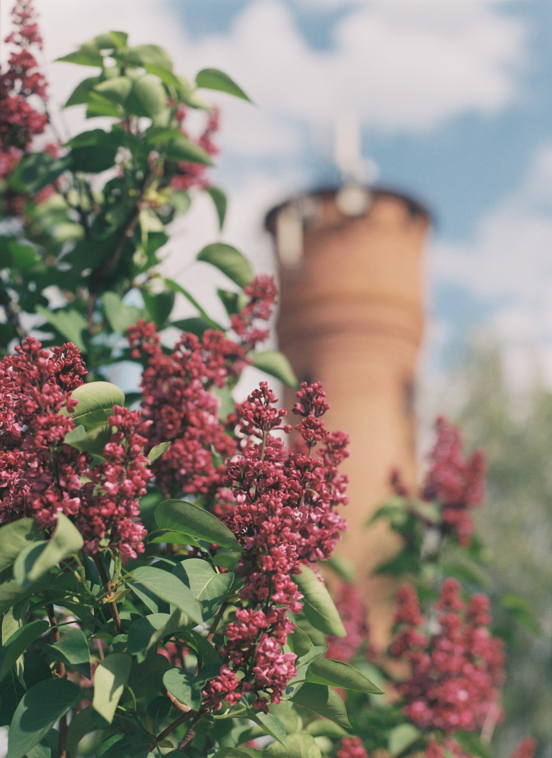 Lilac bush and water tower, hometown. 2025